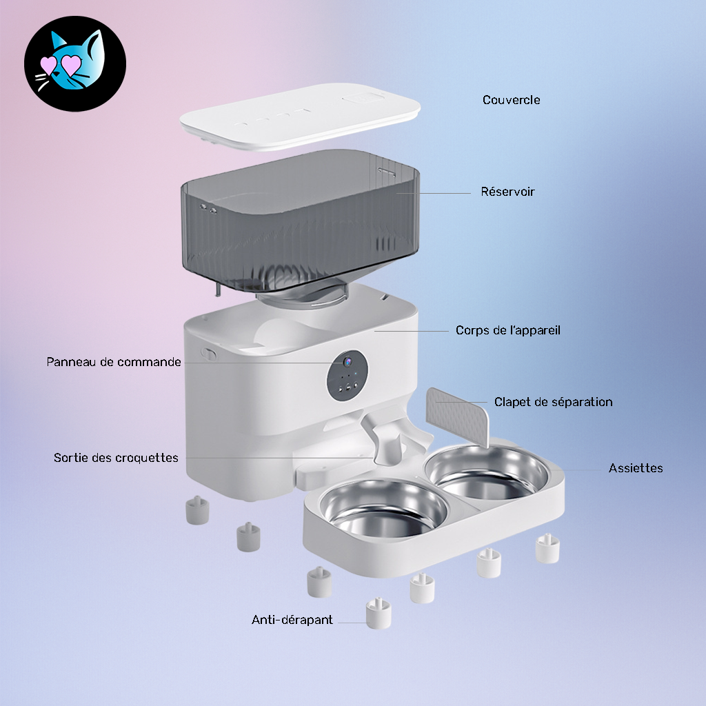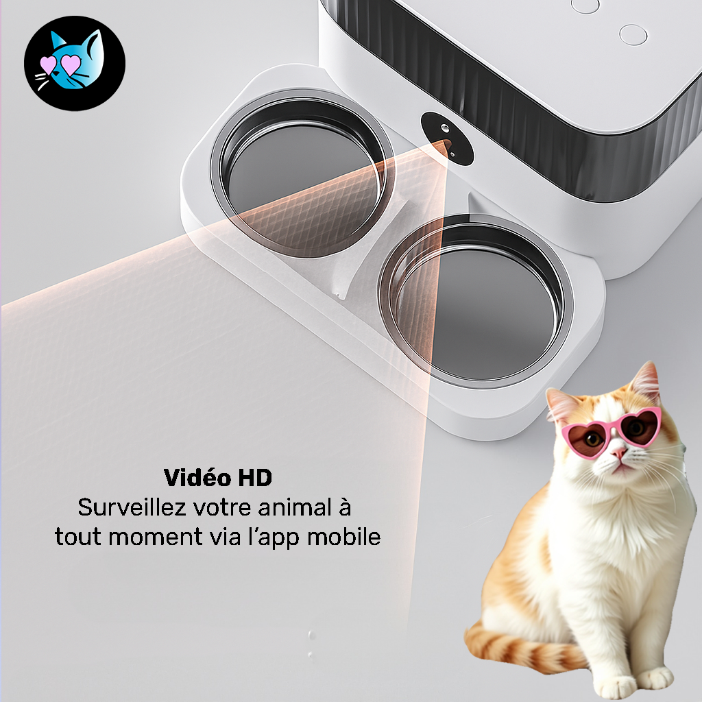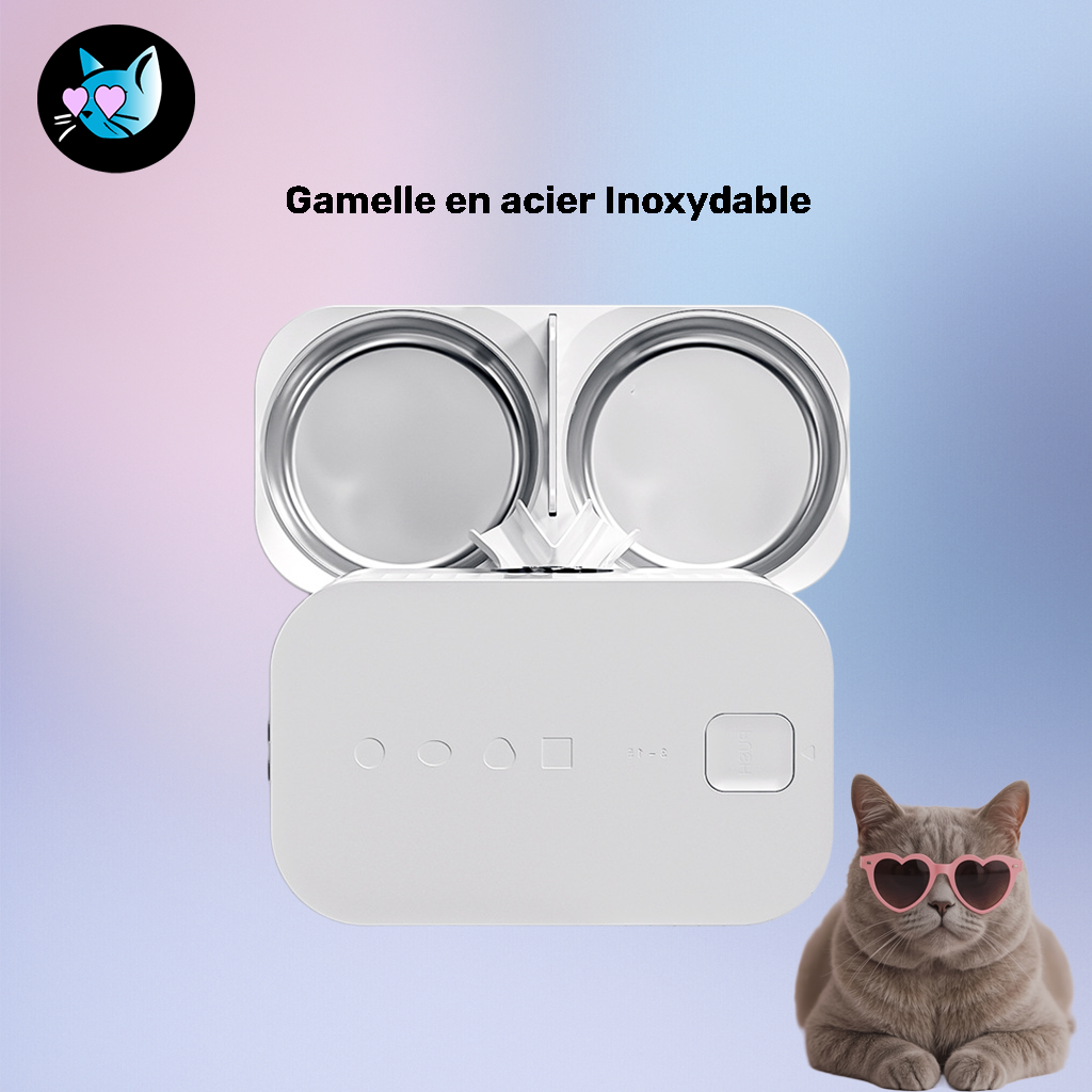• D’un système de distribution automatique des croquettes, synchronisé via une application mobile.