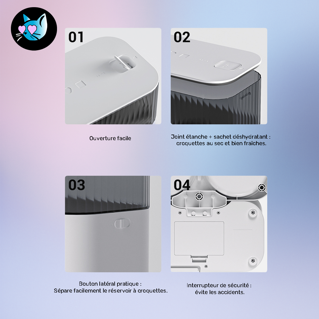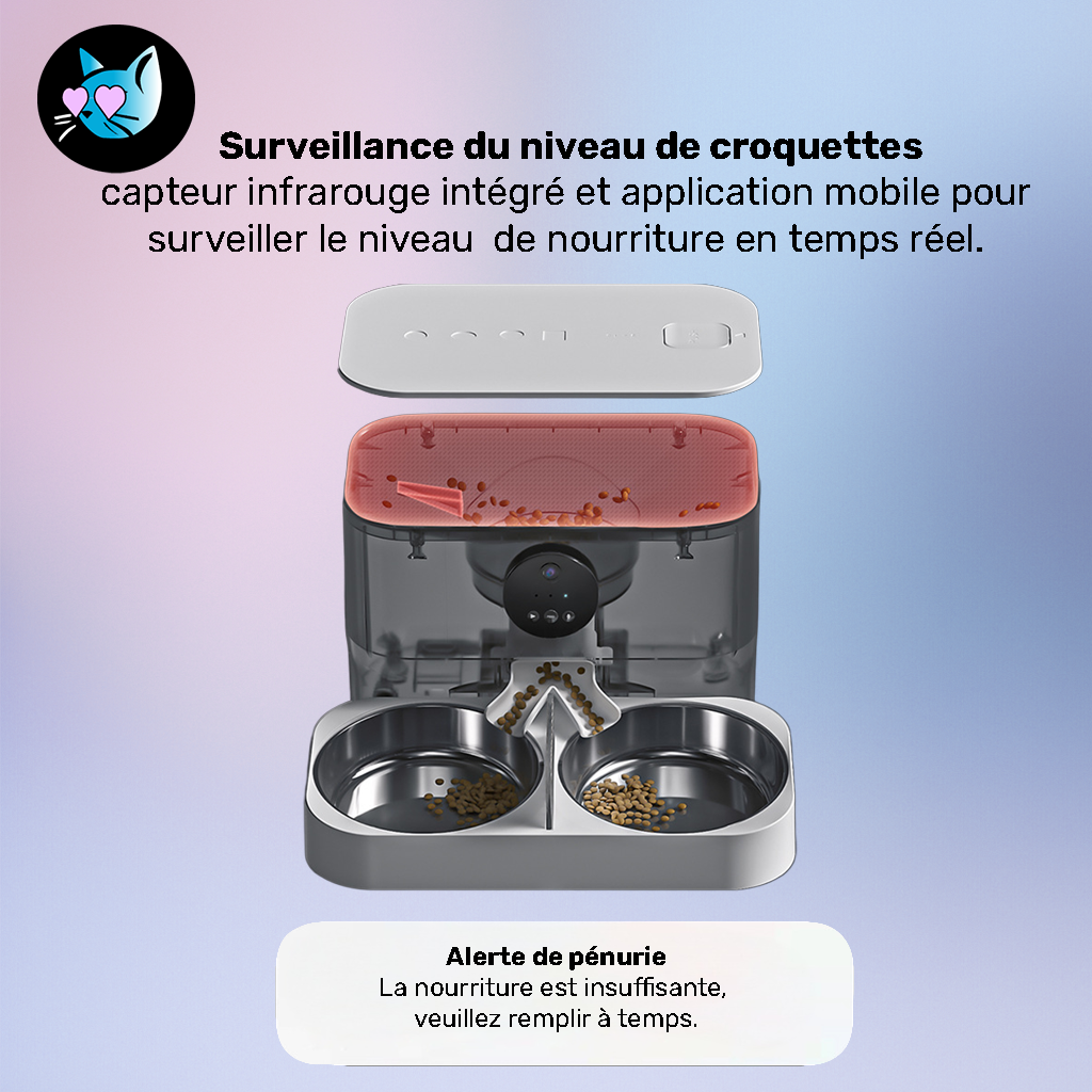• D’un capteur infrarouge qui anticipe les blocages de croquettes et vous alerte si les réserves sont basses.