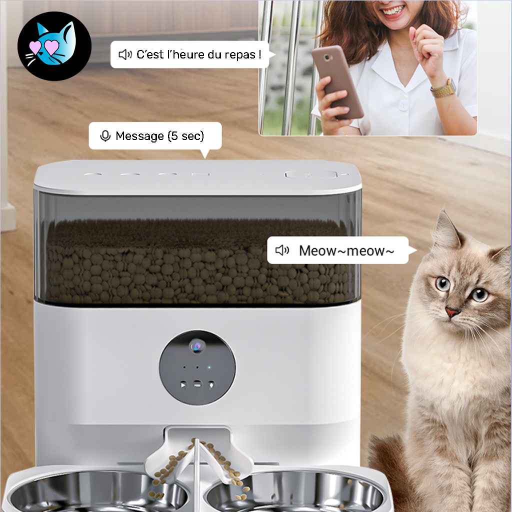• D’un système de diffusion vocale : appelez votre compagnon à l’heure du repas, même à distance !